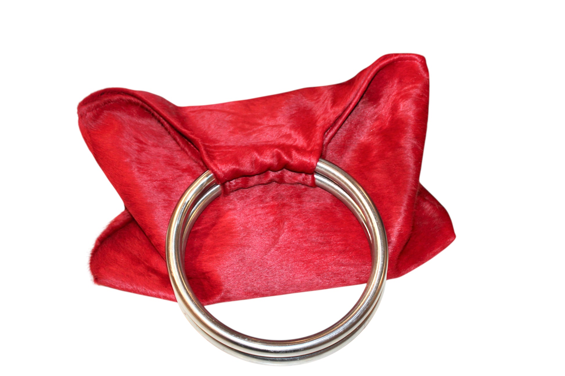 Cowhide tote with large metal hoop handles.